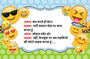 लड़का- तुम लड़कियों की एक बात समझ नहीं आती लड़की- क्या लड़का- अपने से 2-3 साल बड़े लड़को को अंकल बोलने वाली लड़कियां शादी के बाद अपने से 7-8 साल बड़े पति को बेबी कह कर बुलाती हैं, तो बड़ा दुख होता है…….😆🤣🤣🤣🤣😝😝😝 ***************************************************************************************** पप्पू (गप्पू से)- कुछ लोग अपनी बीवी को मैडम बोलते हैं मेरी मैडम ऐसी मेरी मैडम …