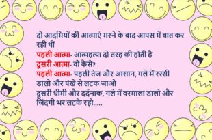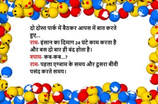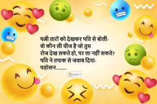 सोहन (मोहन से)- शादी के 12 साल बाद भी बीवी आप पर शक करती हो तो नाराज मत होना मोहन- ऐसा क्यों? सोहन- सोचो, आप आज भी इतने फिट और हैंडसम हैं कि किसी को भी पटा सकते हो…….😆🤣🤣🤣🤣😝😝😝 ************************************************************************************** पत्नी- आपने कुछ सुना पति- क्या? पत्नी- जिन पंडित जी ने अपनी शादी करवाई थी, आज वो मर गए पति- …