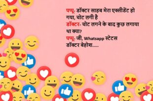 पत्नी (पति से)- तुम मुझे दो ऐसी बातें बोलो, जिनमें से एक को सुनकर मैं खुश हो जाऊं और दूसरी को सुनकर नाराज हो जाऊं पति- पहली बात तुम मेरी जिंदगी हो और दूसरी लानत है ऐसी जिंदगी पर…….😆🤣🤣🤣🤣😝😝😝 **************************************************************************************** डॉक्टर- क्या बात है? मरीज- कुत्ते ने काट लिया है डॉक्टर- तुमने बाहर बोर्ड पर नहीं पढ़ा, मरीज देखने का …