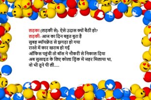 प्रेमिका- जानू तुम हफ्ते में कितनी बार दाढ़ी बनाते हो? प्रेमी – दिन में 20-30 बार! प्रेमिका- पागल हो एक दिन में 20-30 बार कौन दाढ़ी बनाता है? प्रेमी- अरे मैं नाई हूं!😆🤣🤣🤣🤣😝😝😝 ************************************************************************************ नौकरानी- मालकिन, मुझे 10 दिन की छुट्टी चाहिए मालकिन- अगर तू छुट्टी पर चली गई, तो फिर तेरे साहब का नाश्ता कौन बनाएगा? टिफिन कौन पैक …