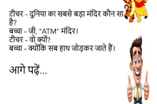 टीचर – दुनिया का सबसे बड़ा मंदिर कौन सा है? बच्चा – जी, “ATM” मंदिर। टीचर – वो क्यों? बच्चा – क्योंकि सब हाथ जोड़कर जाते हैं।😊😊😊😊 *********************************** पत्नी – आजकल तुम मुझसे बात क्यों नहीं करते? पति – क्योंकि नेटवर्क समस्या है।😊😊😊😊 *********************************** पप्पू – मम्मी, मुझे मच्छर काट रहा है। मम्मी – बेटा, प्यार से काटने दे, शायद …