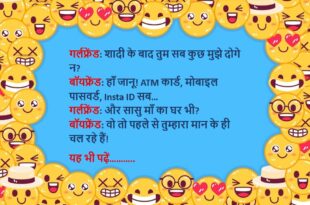 गर्लफ्रेंड: तुमने मेरा मैसेज पढ़ा और रिप्लाई नहीं किया? बॉयफ्रेंड: सॉरी जान, मैं ऑफिस में बहुत बिज़ी था। गर्लफ्रेंड: बिज़ी थे या फिर उस ‘Anjali_143’ की स्टोरी देख रहे थे? बॉयफ्रेंड: वो…वो तो गलती से क्लिक हो गया। गर्लफ्रेंड: अब गलती से तुम्हारी “शांति” भी चली जाएगी।😆🤣🤣🤣🤣😝😝😝 ************************************************************************************ गर्लफ्रेंड: चलो न आज बढ़िया डिनर पर चलते हैं। बॉयफ्रेंड: ठीक है, …
