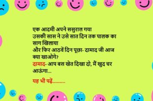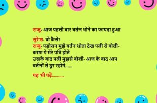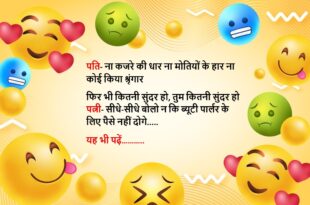 दामाद- महिलाओं को जीवन में बस चार सुख चाहिए ससुर- वो क्या? दामाद- सुंदर काया, पर्स में माया, घर में आया और एक आवाज में पति बोले- मैं अभी आया…..😆🤣🤣🤣🤣😝😝😝 ************************************************************************************ दामाद (ससुर से)- कभी किसी की हाय नहीं लेनी चाहिए ससुर- क्या हुआ? दामाद- सुबह-सुबह पड़ोसन हाय बोल रही थी, मैने ले ली और आपकी बेटी ने देख लिया …
