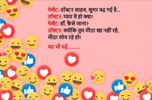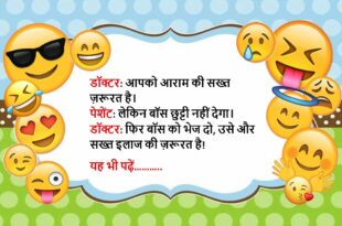 पेशेंट: डॉक्टर साहब, जब मैं चाय पीता हूँ तो मुझे दर्द होता है। डॉक्टर: कप से निकाल कर पिया करो, चूल्हे पर मत रखो मुँह!😆🤣🤣🤣🤣😝😝😝 ************************************************************************************ पेशेंट: डॉक्टर साहब, मुझे भूलने की बीमारी हो गई है। डॉक्टर: कब से? पेशेंट: कब से क्या?😆🤣🤣🤣🤣😝😝😝 ************************************************************************************ डॉक्टर: आपने सिगरेट छोड़ दी? पेशेंट: हाँ, अब बस जलाकर दूसरों को देता हूँ… डॉक्टर: बहुत …