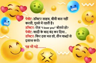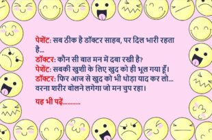 पेशेंट: डॉक्टर साहब, हर सुबह उठते ही सिर भारी लगता है, थकान होती है, मन कुछ करने का नहीं करता… डॉक्टर: ये कोई बीमारी नहीं… पेशेंट: तो क्या है? डॉक्टर: शादी के बाद का सामान्य साइड इफ़ेक्ट है… बीवी ठीक है ना?😆🤣🤣🤣🤣😝😝😝 ************************************************************************************ पेशेंट: डॉक्टर साहब, खाना अच्छा नहीं लगता, नींद नहीं आती, कुछ अच्छा नहीं लगता। डॉक्टर: कब से …