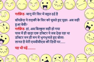 पत्नी (पति से)- मुझे बर्गर खाना है पति ने लाकर दे दिया पत्नी- थैक्स पति- बस थैक्स पत्नी शरमाकर बोली- बताओ फिर क्या कहूं पति- बकवास मत कर, आधा बर्गर मुझे दे……😆🤣🤣🤣🤣😝😝😝 ************************************************************************************ एक बुज़ुर्ग ऑपरेशन टेबल पर लेटे थे बड़ा ऑपरेशन होने वाला था और ऑपरेशन उनका डॉ.दामाद करने वाला था जब डॉ. दामाद आपरेशन थियेटर में आया तो …