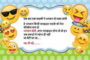 पप्पू (गप्पू से)- यार मैं घरवालों से बहुत परेशान हूं गप्पू- क्यों? पप्पू- अरे मेरे घरवालों को घड़ी में टाइम देखना तक नहीं आता गप्पू- मतलब? पप्पू- सुबह-सुबह मुझे जल्दी उठाते हैं और कहते हैं, उठ जा देख कितना टाइम हो गया….😆🤣🤣🤣🤣😝😝😝 ************************************************************************************ पप्पू (गप्पू से)- यार आज के युग में किसी पर भरोसा नहीं किया जा सकता गप्पू- ऐसा …