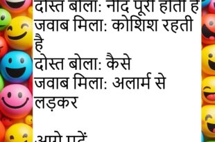 पत्नी बोली: मोबाइल मुझसे ज्यादा प्यारा हैपति बोला: ऐसा नहीं हैपत्नी बोली: फिर चार्जर क्यों ढूँढ रहे होपति बोला: क्योंकि सच बोलता है 😜 ******************************************** टीचर बोले: क्लास में क्यों सो रहे होछात्र बोला: सर सपना अधूरा थाटीचर बोले: कौन साछात्र बोला: छुट्टी का 😂 ******************************************** दोस्त बोला: जिम क्यों नहीं जा रहेजवाब मिला: सब्र कर रहा हूँदोस्त बोला: किस …