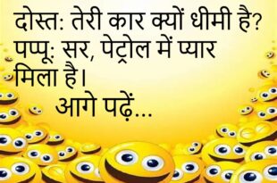 दोस्त: तेरी कार क्यों धीमी है?पप्पू: सर, पेट्रोल में प्यार मिला है।😊😊😊😊 *************************************** टीचर: बताओ, हवा किससे बनती है?छात्र: सर, बिलकुल वैसे ही जैसे WiFi—कहीं से भी!😊😊😊😊 *************************************** पप्पू: मम्मी, मुझे नया मोबाइल चाहिए।मम्मी: क्यों?पप्पू: ताकि नींद आए।😊😊😊😊 *************************************** दोस्त: तेरी किताब कहां है?पप्पू: WiFi खो गया तो किताब भी गायब।😊😊😊😊 *************************************** बॉस: कल मीटिंग क्यों मिस की?कर्मचारी: सर, नींद …