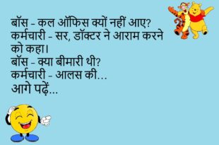 बॉस – कल ऑफिस क्यों नहीं आए? कर्मचारी – सर, डॉक्टर ने आराम करने को कहा। बॉस – क्या बीमारी थी? कर्मचारी – आलस की… 😴 *********************************** पप्पू – यार तुम्हारा WiFi क्यों नहीं चल रहा? गप्पू – अरे भाई, WiFi नहीं, Wife फ्री है… 😅 *********************************** दोस्त – तुम इतनी मोटी क्यों हो गई? दोस्त – खुशखबरी है, मैं …