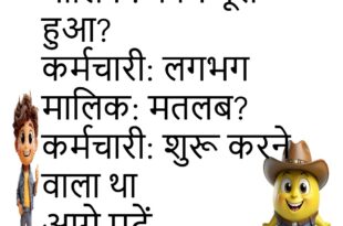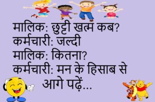 मालिक: फाइल कहाँ है? कर्मचारी: सुरक्षित है मालिक: कहाँ? कर्मचारी: दिमाग में 😂 ********************************** ग्राहक: इतना इंतज़ार क्यों? वेटर: स्पेशल ऑर्डर ग्राहक: कितना स्पेशल? वेटर: धैर्य वाला 😆 ********************************** दोस्त: प्लान क्यों कैंसिल? दोस्त: कारण है दोस्त: क्या? दोस्त: मन 😜 ********************************** मां: होमवर्क किया? बच्चा: लगभग मां: मतलब? बच्चा: सोचा था 😂 ********************************** डॉक्टर: पानी ज्यादा पिया? मरीज़: हाँ …