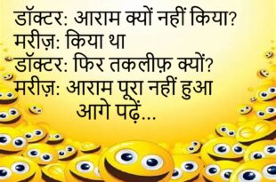 डॉक्टर: आराम क्यों नहीं किया? मरीज़: किया था डॉक्टर: फिर तकलीफ़ क्यों? मरीज़: आराम पूरा नहीं हुआ 😂 ********************************** पत्नी: सब्ज़ी लाए? पति: हाँ पत्नी: कहाँ है? पति: यादों में 😆 ********************************** दोस्त: कॉल क्यों नहीं उठाया? दोस्त: उठाया था दोस्त: फिर आवाज़ क्यों नहीं? दोस्त: नेटवर्क शर्मीला था 😜 ********************************** मालिक: लेट क्यों आए? कर्मचारी: जल्दी निकल गया था …