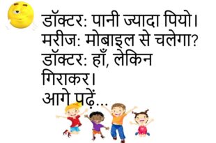 डॉक्टर: पानी ज्यादा पियो। मरीज: मोबाइल से चलेगा? डॉक्टर: हाँ, लेकिन गिराकर।😊😊😊😊 ************************************** पापा: फोन से दूर रहो। बेटा: ठीक है। पापा: फिर टीवी क्यों? बेटा: बड़ा फोन है।😊😊😊😊 ************************************** टीचर: जवाब क्यों नहीं दे रहे? स्टूडेंट: सोच रहा हूँ। टीचर: कब से? स्टूडेंट: सवाल सुनते ही।😊😊😊😊 ************************************** दोस्त: आज बहुत लेट क्यों? लड़का: अलार्म नहीं बजा। दोस्त: मोबाइल था …