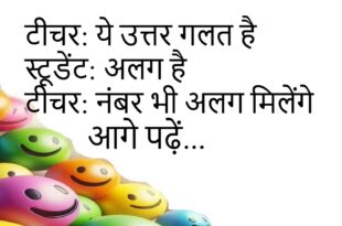 टीचर: पढ़ा था न? स्टूडेंट: हाँ टीचर: कब, किससे?😊😊😊😊 ********************************** पिता: जिम्मेदारी कब लोगे? बेटा: जल्द पिता: कैलेंडर में?😊😊😊😊 ********************************** माँ: कमरे में शोर क्यों? बेटा: पढ़ाई माँ: हँसी किस विषय की?😊😊😊😊 ********************************** दोस्त: कॉल क्यों नहीं किया? लड़का: चार्ज नहीं था दोस्त: बहाना फुल चार्ज😊😊😊😊 ********************************** टीचर: ये उत्तर गलत है स्टूडेंट: अलग है टीचर: नंबर भी अलग मिलेंगे😊😊😊😊