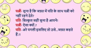 मंटू की पत्नी गुस्सा होकर मायके चली जाती है मंटू अपनी ससुराल में फोन करता है, उधर से सास की आवाज आती है- कितना बार कहा है तुमसे अब वो न तुम्हारे घर आएगी और न तुम्हारा फोन उठाएगी तो क्यों बार-बार फोन करते हो यहां मंटू- कुछ नहीं बस सुनकर अच्छा लगता है……😆🤣🤣🤣🤣😝😝😝 ************************************************************************************ पति-पत्नी हाथ पकड़े बाजार में …