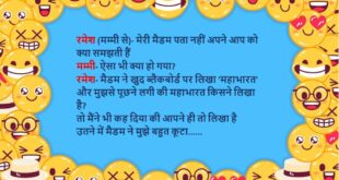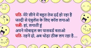 सुरेश-कल गर्लफ्रेंड की शादी में गया था रमेश- फिर क्या हुआ? सुरेश- वहां 2 और गर्लफ्रेंड बन गईं अब उनकी भी शादी में जाऊंगा सुनकर रमेश की बोलती बंद हो गई…..😆🤣🤣🤣🤣😝😝😝 ************************************************************************************ एक लड़की किसी लड़के से व्हाट्सप्प पर चैट कर रही थी लड़का- हेलो लड़की- हाय, क्या कर रहे हो? लड़का- मैं एक खूबसूरत लड़की से बात कर रहा …