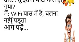 बीवी: तुम मुझे मिस करते हो? पति: हाँ। WiFi की तरह 😆 ***************************************** दोस्त: तू उदास क्यों है? मैं: नेट स्लो है 😂 ***************************************** डॉक्टर: वजन क्यों बढ़ रहा है? मरीज: दवाई मीठी है 😜 ***************************************** माँ: फोन क्यों चलाता है? बेटा: ज्ञान ढूंढ रहा हूँ 😂