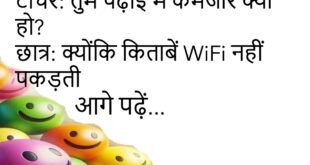 पापा: ये कंप्यूटर क्यों बंद है?बेटा: क्योंकि ब्रेन ऑफलाइन था 😆 *********************************** मम्मी: खाना खाया?बच्चा: हाँ… अपने सपनों में 😄 *********************************** दोस्त: क्यों परेशान हो?मैं: मोबाइल की बैटरी 1% है 😆 *********************************** टीचर: तुम पढ़ाई में कमजोर क्यों हो?छात्र: क्योंकि किताबें WiFi नहीं पकड़ती 😄 *********************************** लड़की: ये जोक सुनाया?लड़का: नहीं, अपने दिल से 😆