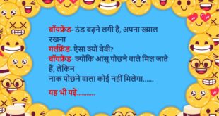 बॉयफ्रेंड- ठंड बढ़ने लगी है, अपना ख्याल रखना गर्लफ्रेंड- ऐसा क्यों बेबी? बॉयफ्रेंड- क्योंकि आंसू पोछने वाले मिल जाते हैं, लेकिन नाक पोछने वाला कोई नहीं मिलेगा……😆🤣🤣🤣🤣😝😝😝 ************************************************************************************ दामाद- एक बात समझ नहीं आती सासू मां सास- कौनसी बात? दामाद- जब बच्चा पैदा होता है, मां उसके सर पर हाथ फेरती है तो उसके बाल बढ़ना चालू होते हैं, लेकिन …