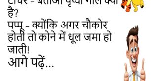 टीचर – पप्पू, बताओ सूर्य कहाँ उगता है? पप्पू – जहाँ से सेल्फी अच्छी आती हो सर! ☀️📱 ********************************************टीचर – बताओ पृथ्वी गोल क्यों है? पप्पू – क्योंकि अगर चौकोर होती तो कोने में धूल जमा हो जाती! 😆 ******************************************** टीचर – तुम्हें सबसे ज़्यादा क्या पसंद है? स्टूडेंट – छुट्टियाँ! 🏖️ ******************************************** मास्टर – तुम स्कूल देर से क्यों …
