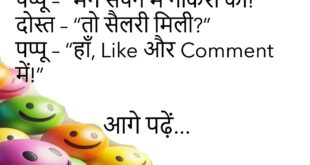 दोस्त – “तेरे फोन की स्क्रीन क्यों टूटी?” पप्पू – “सेल्फी ली थी, हैंडसम निकल गया, फोन संभाल नहीं पाया!”😂😂😂😂 ************************************ दोस्त – “तू सुबह-सुबह हँस क्यों रहा था?” पप्पू – “सपने में पिज़्ज़ा फ्री मिला!”😂😂😂😂 ************************************ पप्पू – “तेरी ज़िंदगी कैसी है?” दोस्त – “जैसे YouTube Ad – स्किप नहीं कर सकता!”😂😂😂😂 ************************************ दोस्त – “तेरे पास पैसे क्यों …