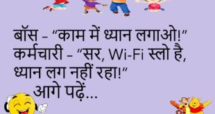 बॉस – “काम में ध्यान लगाओ!” कर्मचारी – “सर, Wi-Fi स्लो है, ध्यान लग नहीं रहा!”😂😂😂😂 ************************************ बॉस – “आप कितनी जल्दी टाइप करते हैं?” कर्मचारी – “सर, इतना जल्दी कि ‘टाइपो’ खुद डर जाए!”😂😂😂😂 ************************************ कर्मचारी – “सर, मैं बीमार हूं!” बॉस – “कोई बात नहीं, मेल कर दो!” कर्मचारी – “मेल भेजने की हालत नहीं है!” बॉस – …