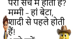 डॉक्टर – सुबह उठकर क्या करते हो? मरीज – WhatsApp खोलकर फिर से सो जाता हूँ! ***************************************** टीचर – ‘महिलाओं’ पर निबंध लिखो। छात्र – महिलाओं पर निबंध नहीं, किताबें लिखी जा सकती हैं सर! ***************************************** पत्नी – तुम इतने गुमसुम क्यों हो? पति – क्योंकि तुम बोल रही हो! ***************************************** पप्पू – मम्मी, क्या परी सच में होती हैं? …