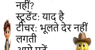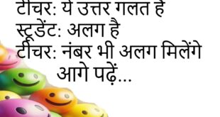 टीचर: पढ़ा था न? स्टूडेंट: हाँ टीचर: कब, किससे?😊😊😊😊 ********************************** पिता: जिम्मेदारी कब लोगे? बेटा: जल्द पिता: कैलेंडर में?😊😊😊😊 ********************************** माँ: कमरे में शोर क्यों? बेटा: पढ़ाई माँ: हँसी किस विषय की?😊😊😊😊 ********************************** दोस्त: कॉल क्यों नहीं किया? लड़का: चार्ज नहीं था दोस्त: बहाना फुल चार्ज😊😊😊😊 ********************************** टीचर: ये उत्तर गलत है स्टूडेंट: अलग है टीचर: नंबर भी अलग मिलेंगे😊😊😊😊