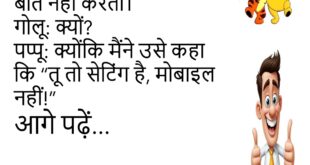 टीचर: बताओ, सबसे पुराना जीव कौन सा है?पप्पू: ज़ेबरा, क्योंकि वो आज भी ब्लैक एंड व्हाइट में है! ************************************************ डॉक्टर: तुम्हें क्या परेशानी है?मरीज़: जब सोता हूँ तो सपने में क्रिकेट खेलता हूँ।डॉक्टर: ये लो दवाई, आज से लेना शुरू करो।मरीज़: कल से लूंगा, आज फाइनल है! ************************************************ पप्पू: यार मेरी गर्लफ्रेंड मुझसे बात नहीं करती।गोलू: क्यों?पप्पू: क्योंकि मैंने उसे …