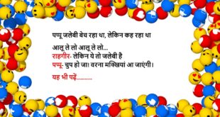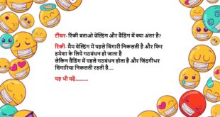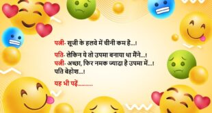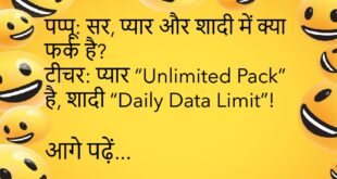 टीचर: बताओ बच्चों, सबसे प्यारा फल कौन सा है? पप्पू: मोबाइल का “Apple”, मैम! 🍎📱 ************************************* डॉक्टर: आपको क्या तकलीफ है? मरीज: बीवी से बात करते-करते बैटरी डाउन हो जाती है — मेरी नहीं, मोबाइल की! 😅 ************************************* पत्नी: सुनिए, मैं मोटी लगती हूँ क्या? पति: नहीं, बस स्केल बदलना पड़ेगा! 📏🤣 ************************************* टीचर: ईमानदारी किसे कहते हैं? पप्पू: जो …