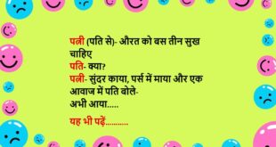 जीजा- केवल दो तरह के आदमी औरत को समझ नहीं पाते साली- कौन-कौन? जीजा- कुंवारे और विवाहित साली- और जो समझ जाते हैं वो? जीजा- वो तो फिर साधु-संत बनकर आश्रम पकड़ लेते हैं…..😆🤣🤣🤣🤣😝😝😝 ************************************************************************************ मैंने पूछा चांद से देखा है कहीं मेरे यार सा हसीं, चांद ने कहा- इश्क में अंधा तू है, मैं नहीं….. चांद ने लड़कियों पर …