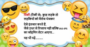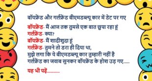 ससुर- इतना डरे हुए क्यों हो दामाद जी? दामाद- आपकी बेटी को डराने के लिए नकली छिपकली लेकर आया, तो देखा वो जिंदा सांप पकड़कर बाहर फेक रही थी…..😆🤣🤣🤣🤣😝😝😝 ************************************************************************************ सुरेश (मोहन से)- कभी किसी की हाय नहीं लेनी चाहिए मोहन- क्या हुआ? सुरेश- सुबह-सुबह पड़ोसन हाय बोल रही थी, मैने ले ली और बीवी ने देख लिया मोहन- फिर …