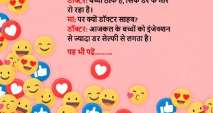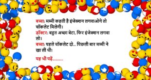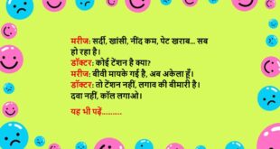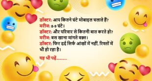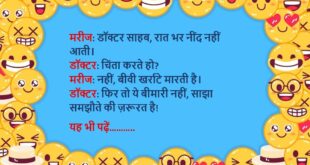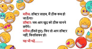 मरीज: डॉक्टर, मेरी बीवी मुझे रोज़-रोज़ चिढ़ाती है, क्या दवा दूँ? डॉक्टर: दवा नहीं, ज़्यादा समझदारी और प्यार दो, और कोशिश करो खुद भी थोड़ा शांत रहो। मरीज: अरे, आप डॉक्टर हैं या शादी सलाहकार?😆🤣🤣🤣🤣😝😝😝 ************************************************************************************ डॉक्टर: आप धूम्रपान क्यों करते हो? मरीज: जी, खुश रहने के लिए। डॉक्टर: खुश रहने के लिए धुआं छोड़ना पड़ता है? मरीज: जी, और …