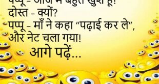 लड़की – तुम मुझे मिस करते हो?लड़का – नहीं, मैं तो “मिस कॉल” करता हूँ! 😆 ************************************* पत्नी – मैं तुमसे बहुत नाराज़ हूँ!पति – वाईफाई जैसा व्यवहार बंद करो, कभी कनेक्ट तो कभी डिसकनेक्ट! 😜 ************************************* टीचर – बच्चे, परीक्षा में क्या लेकर आना है?पप्पू – हिम्मत और थोड़ी सी किस्मत सर! 😂 ************************************* डॉक्टर – आपको कौन सी …