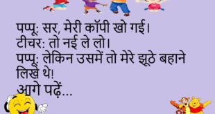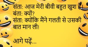 पति: तुम मेरे बिना क्या करोगी?पत्नी: जो अभी कर रही हूँ — तुम्हारी बातें सुन रही हूँ!😊😊😊 ****************************************** पप्पू: मेरी बीवी रोज़ मुझे 10 बार फोन करती है।बंता: वाह! प्यार करती है।पप्पू: नहीं, चेक करती है कि मर तो नहीं गया!😊😊😊 ****************************************** टीचर: बच्चों, भारत की राजधानी कौन सी है?छात्र: सर, आज कौन सा चैप्टर चल रहा है? 😂 ****************************************** …