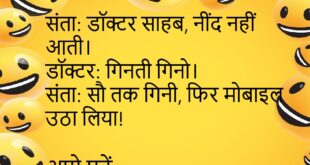 संता: डॉक्टर साहब, नींद नहीं आती।डॉक्टर: गिनती गिनो।संता: सौ तक गिनी, फिर मोबाइल उठा लिया!😊😊😊😊 ****************************************** बॉस: तुम्हें ऑफिस में टाइम क्यों नहीं मिलता?कर्मचारी: सर, टाइम तो होता है, बस काम बीच में आ जाता है।😊😊😊😊 ****************************************** पप्पू: मम्मी, भूख लगी है।मम्मी: चाय बना ले।पप्पू: भूख लगी है, नींद नहीं! 😂 ****************************************** पत्नी: तुम मुझे छोड़ दोगे क्या?पति: नहीं, वाईफाई …