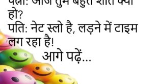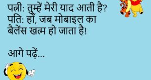 पत्नी: मैं तुम्हारे बिना नहीं रह सकती।पति: चलो अच्छा है, बिजली बिल भी आधा हो जाएगा।😊😊😊 ****************************************** बंता: तेरी बीवी गुस्से में क्या करती है?संता: व्हाट्सएप स्टेटस बदल देती है — Feeling Dangerous!😊😊😊 ****************************************** दोस्त: यार, तुम हमेशा मोबाइल क्यों देखते रहते हो?पप्पू: क्योंकि उसमें वो है — जो ज़िंदगी में नहीं है!😊😊😊 ****************************************** पत्नी: आज तुम बहुत शांत क्यों …