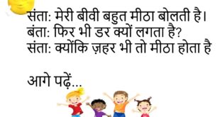 संता: मेरी बीवी बहुत मीठा बोलती है।बंता: फिर भी डर क्यों लगता है?संता: क्योंकि ज़हर भी तो मीठा होता है!😊😊😊😊 ****************************************** टीचर: अगर धरती घूमना बंद कर दे तो क्या होगा?छात्र: सर, फिर हम सब गिर जाएँगे — क्योंकि अब तक सबको घुमा रखा है!😊😊😊😊 ****************************************** बॉयफ्रेंड: तुम इतनी खूबसूरत कैसे लगती हो?गर्लफ्रेंड: फ़िल्टर ऑन है।😊😊😊😊 ****************************************** पति: आज खाना …
