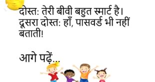 दोस्त: तेरी बीवी बहुत स्मार्ट है।दूसरा दोस्त: हाँ, पासवर्ड भी नहीं बताती!😊😊😊😊 ****************************************** टीचर: बच्चों, सच बोलना बहुत जरूरी है।पप्पू: हाँ सर, झूठ बोलने के लिए तो शादी है!😊😊😊😊 ****************************************** पति: मैं तुम्हारे लिए चाँद तारे तोड़ लाऊँगा।पत्नी: पहले LPG सिलेंडर ही ले आओ, वो खत्म है!😊😊😊😊 ****************************************** बच्चा: पापा, क्या मैं बड़ा होकर तुम्हारे जैसा बन सकता हूँ?पापा: नहीं …