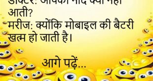 डॉक्टर: आपको नींद क्यों नहीं आती?मरीज: क्योंकि मोबाइल की बैटरी खत्म हो जाती है।😊😊😊😊 ****************************************** पत्नी: तुम मुझे कहाँ लेकर जाओगे शादी की सालगिरह पर?पति: कोर्ट! 😂 ****************************************** बच्चा: पापा, आप ऑफिस में क्या करते हो?पापा: बेटा, सबको बोलता हूँ काम करो।बच्चा: फिर आप क्या करते हो?पापा: वही जो तुम स्कूल में करते हो — मोबाइल चलाता हूँ!😊😊😊😊 ****************************************** पुलिस: …