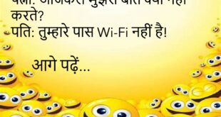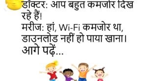 पत्नी: आजकल मुझसे बात क्यों नहीं करते?पति: तुम्हारे पास Wi-Fi नहीं है!😊😊😊😊 *********************************** बच्चा: पापा, Wi-Fi बंद कर दो।पापा: क्यों बेटा?बच्चा: मम्मी से बात करनी है, वो भी मोबाइल पर हैं।😊😊😊😊 *********************************** टीचर: बताओ, गधा और इंसान में क्या फर्क है?छात्र: टाइम आने पर कोई नहीं बताता!😊😊😊😊 *********************************** गर्लफ्रेंड: तुमने खाना खाया?बॉयफ्रेंड: नहीं, तुम्हारी dp देखकर पेट भर गया।😊😊😊😊 *********************************** …