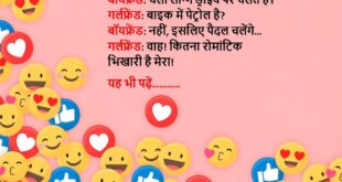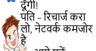 बॉयफ्रेंड: यार तुम्हारा मूड हर घंटे बदलता है… गर्लफ्रेंड: तो क्या करूं, मौसम की तरह हूं! बॉयफ्रेंड: पर प्रॉब्लम ये है कि तुम्हारे साथ मौसम का अपडेट भी नहीं आता, अचानक बारिश, आंधी या तूफान आ जाता है!😆🤣🤣🤣🤣😝😝😝 ************************************************************************************ गर्लफ्रेंड (रोमांटिक अंदाज़ में): तुम हमेशा मेरे साथ रहोगे ना? बॉयफ्रेंड: हां, जब तक मोबाइल की बैटरी और नेट पैक साथ …