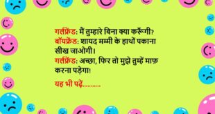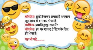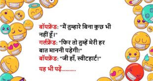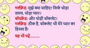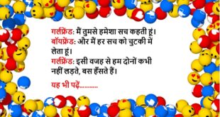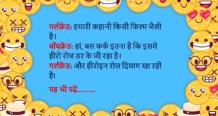 गर्लफ्रेंड: तुम मुझसे प्यार करते हो या नहीं? बॉयफ्रेंड: करता हूं, इसलिए तो तुम्हारे गुस्से में भी तुम्हें छोड़ता नहीं। गर्लफ्रेंड: मतलब तुम्हें मेरा गुस्सा भी पसंद है? बॉयफ्रेंड: हाँ, क्योंकि उसी में तो तुम्हारी असली परवाह दिखती है।😆🤣🤣🤣🤣😝😝😝 ************************************************************************************ बॉयफ्रेंड: तुम्हारी आँखें मेरे दिल की कहानी बताती हैं। गर्लफ्रेंड: फिर बताओ, मेरी आँखों में क्या है? बॉयफ्रेंड: ये बताना …