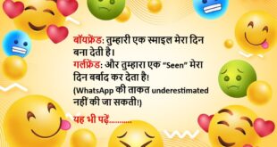 गर्लफ्रेंड (गुस्से में): तुम हर बार झगड़े के बाद मुझसे सॉरी क्यों नहीं कहते? बॉयफ्रेंड: क्योंकि मुझे पता है कि 5 मिनट में तुम खुद ही बात करने लगोगी… WiFi से भी तेज़ Connect होती हो तुम!😆🤣🤣🤣🤣😝😝😝 ************************************************************************************ गर्लफ्रेंड: चलो कुछ रोमांटिक करते हैं। बॉयफ्रेंड: ठीक है, चलो तुम्हारे लिए बिना WiFi के 1 घंटा बैठता हूँ। गर्लफ्रेंड: ओह माय …
