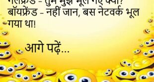 गर्लफ्रेंड – तुम मुझे भूल गए क्या?बॉयफ्रेंड – नहीं जान, बस नेटवर्क भूल गया था! 📶 ************************************** डॉक्टर – तुम्हें क्या हुआ?मरीज – दिल में दर्द है… शायद इंटरनेट स्लो चल रहा है! 🥴 ************************************** टीचर – ‘माँ’ का पर्यायवाची बताओ।छात्र – वाई-फाई! हर जगह कनेक्शन बना रहता है! 😂 ************************************** सास – बहू, ये खाना इतना नमकीन क्यों है?बहू …