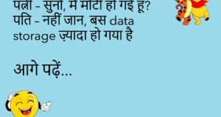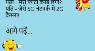 पत्नी – सुनो, मैं मोटी हो गई हूँ?पति – नहीं जान, बस data storage ज़्यादा हो गया है! 😜 ************************************** डॉक्टर – आपकी तबीयत क्यों खराब है?मरीज – हर दिन सोमवार लगता है, सर! 😩 ************************************** बॉस – रिपोर्ट कहाँ है?कर्मचारी – सर, अभी “Loading” है! 🌀 ************************************** गर्लफ्रेंड – मुझे याद किया?बॉयफ्रेंड – हाँ, Instagram स्टोरी में टैग भी …