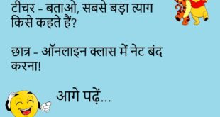 पत्नी – मुझे नई ड्रेस चाहिए!पति – मेरी जान, पुरानी ड्रेस ने क्या किया?पत्नी – वो पुरानी हो गई! 😆 *********************************************** टीचर – तुम परीक्षा में फेल कैसे हो गए?छात्र – मैडम, पेपर में बहुत सवाल थे, और मैं अकेला था! 😂 *********************************************** गर्लफ्रेंड – मैं नाराज़ हूँ!बॉयफ्रेंड – ठीक है, मैं ऑनलाइन गेम खेल लूँ तब तक! 😜 *********************************************** …