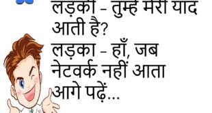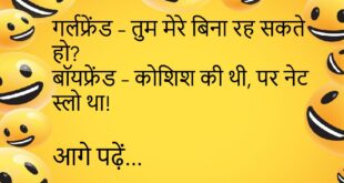 गर्लफ्रेंड – तुम मेरे बिना रह नहीं सकते ना?बॉयफ्रेंड – कोशिश की थी… पर नेट स्लो था! 🤣 *********************************************** टीचर – बताओ, ईमानदारी क्या होती है?पप्पू – जब मोबाइल गिर जाए और सामने वाला उसे लौटाने की बजाय चार्ज कर दे! 😜 *********************************************** शादी के बाद लड़का – मुझे तुमसे प्यार है।लड़की – पहले भी कहते थे।लड़का – तब ट्रायल …