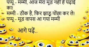 पप्पू – मम्मी, आज मेरा मूड नहीं है पढ़ाई का!मम्मी – ठीक है, फिर झाड़ू-पोंछा कर ले!पप्पू – मूड वापस आ गया मम्मी! 📚😂 *********************************************** पत्नी – सुनिए, मैं मोटी लग रही हूँ क्या?पति – तुम्हें देखकर तो स्केल भी शर्माता है! 😆 *********************************************** टीचर – जो झूठ बोलेगा उसे सज़ा मिलेगी!पप्पू – मैडम, आप बहुत सुंदर हैं! 😜 *********************************************** …