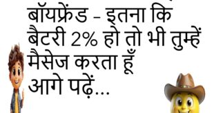 गर्ल – तुम मेरी आँखों में क्या देखते हो? बॉय – नेटवर्क सिग्नल 😂 ******************************************* संता – डॉक्टर, मेरी याददाश्त बहुत कमजोर है डॉक्टर – कब से? संता – क्या कब से? 😆 ******************************************* पत्नी – आज खाना कौन बनाएगा? पति – चलो बाहर खाते हैं पत्नी – वाह! अब तुम भी स्मार्ट हो गए 😜 ******************************************* बॉय – जानू, …